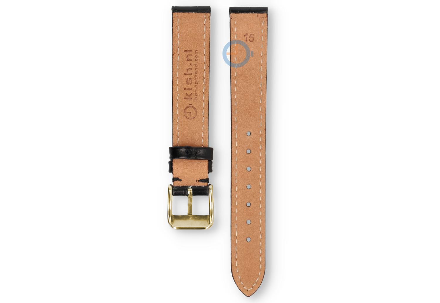 15mm uneven leather strap - black. This watch strap has an odd size: 15mm. You can find an odd size watch strap at Watchstraponline.com in different sizes and colours. This high quality leather has tone-in-tone stitches and a classic croco-print. The gold coloured buckle is in high-gloss steel and comes fitted.