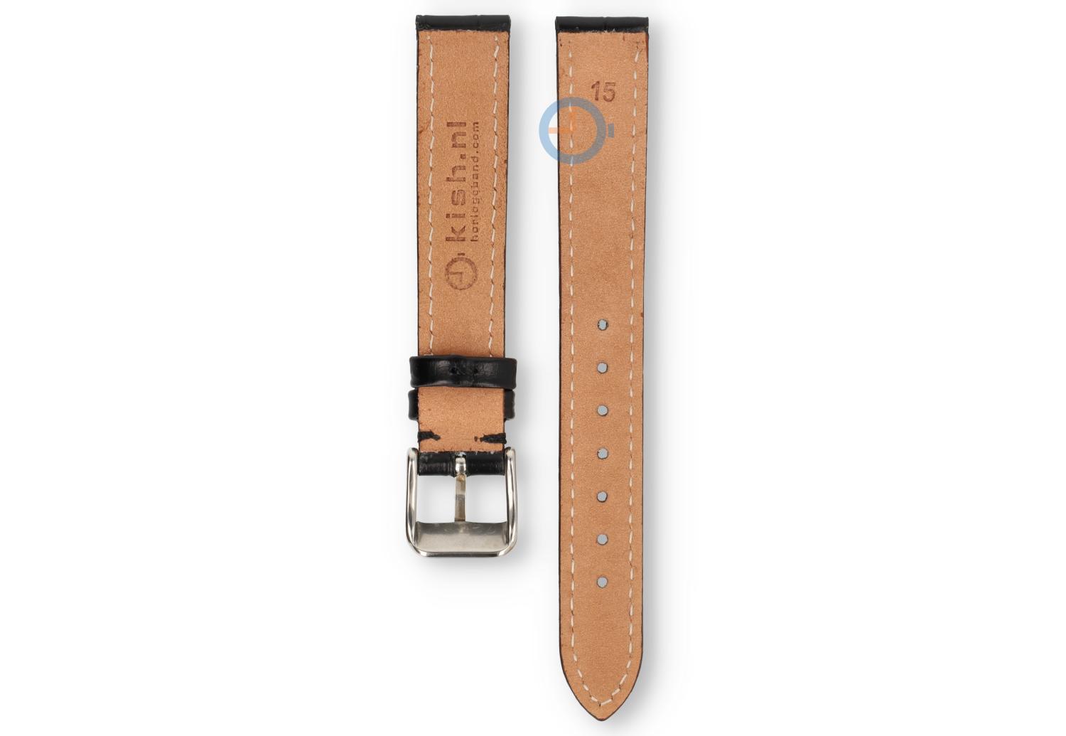 15mm uneven leather strap - black. This watch strap has an odd size: 15mm. You can find an odd size watch strap at Watchstraponline.com in different sizes and colours. This high quality leather has tone-in-tone stitches and a classic croco-print. The buckle is in high-gloss steel and comes fitted.