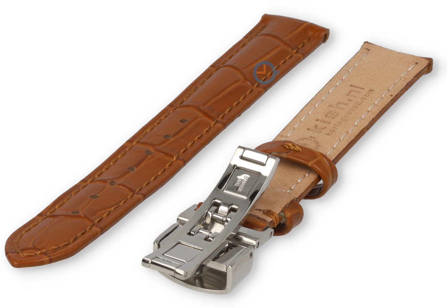 15mm uneven leather strap. This luxury watch strap features a butterfly clasp that not only exudes classic style and quality but also ensures safety. - cognacbrown. This watch strap has an odd size: 15mm. You can find an odd size watch strap at Watchstraponline.com in different sizes and colours. This high quality leather has tone-in-tone stitches and a classic croco-print.