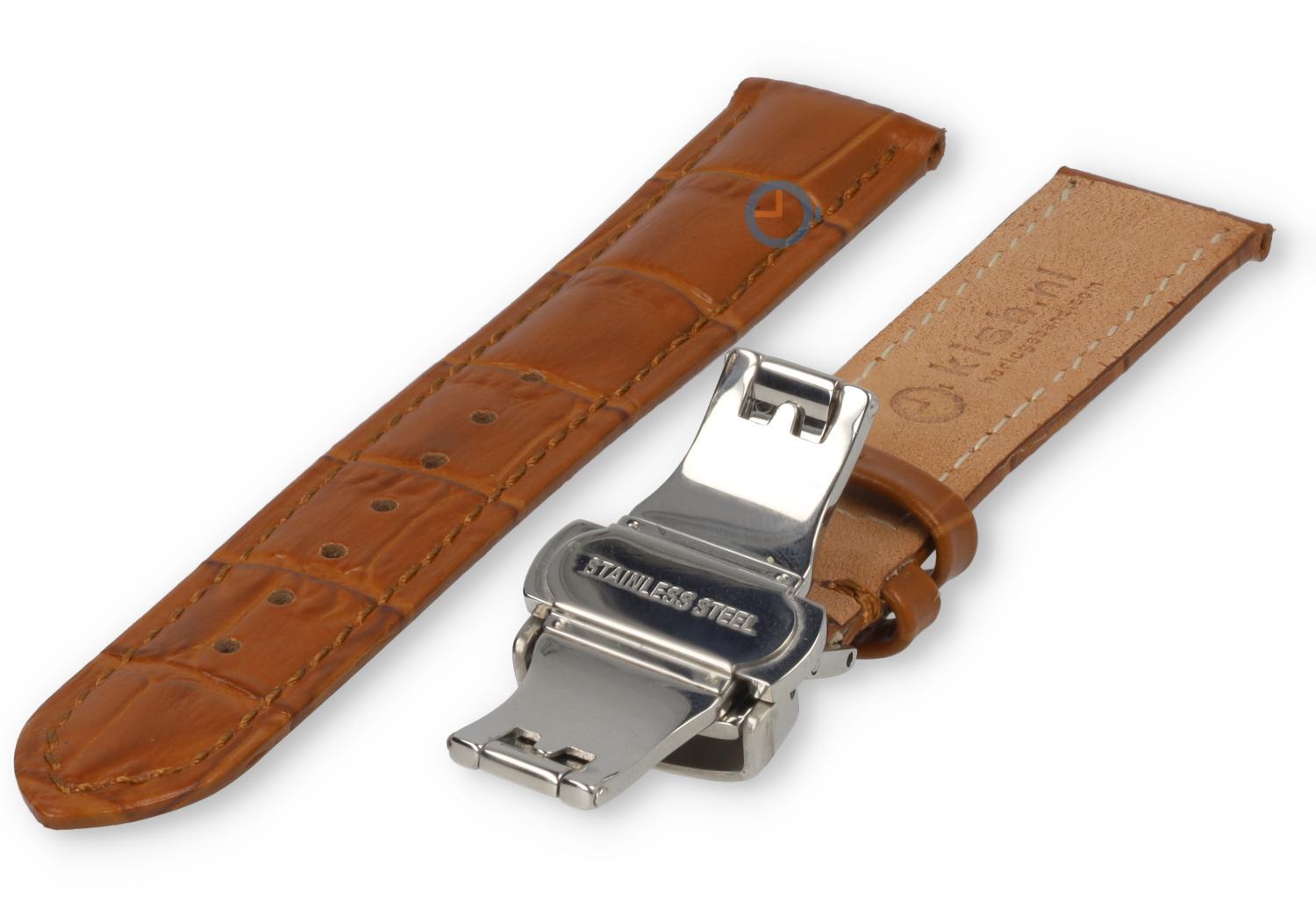 17mm uneven leather strap. This luxury watch strap features a butterfly clasp that not only exudes classic style and quality but also ensures safety. - cognacbrown. This watch strap has an odd size: 17mm. You can find an odd size watch strap at Watchstraponline.com in different sizes and colours. This high quality leather has tone-in-tone stitches and a classic croco-print.
