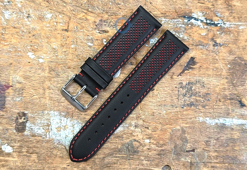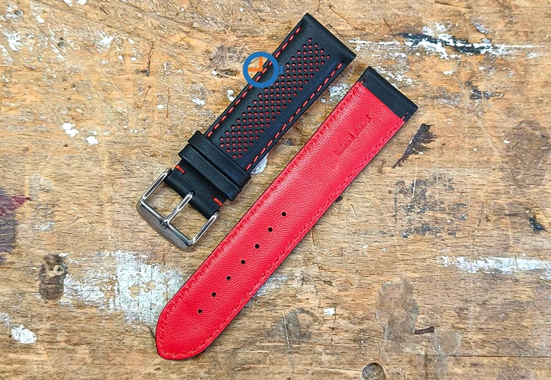 Looking for a watch strap different from the usual? Order this 18mm hybrid strap - black with red. This watch strap is made of genuine calf leather and is perforated. The holes are lasered before the bands are put together.