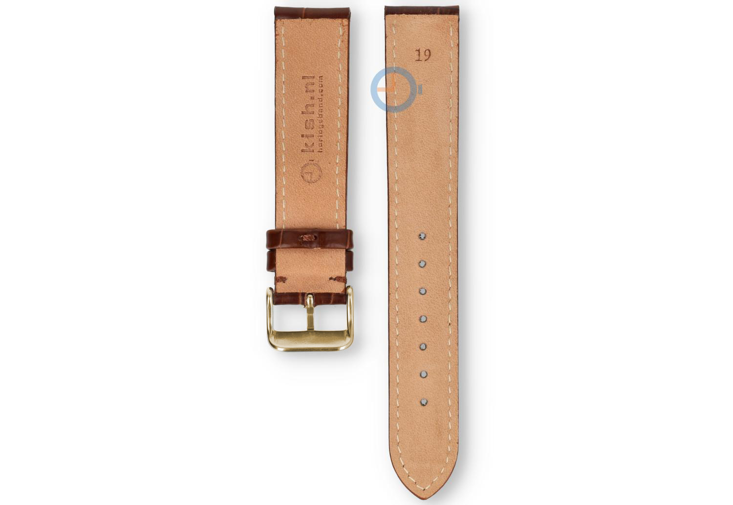 19mm uneven leather strap - dark brown. This watch strap has an odd size: 19mm. You can find an odd size watch strap at Watchstraponline.com in different sizes and colours. This high quality leather has tone-in-tone stitches and a classic croco-print. The buckle is gold in high-gloss steel and comes fitted.