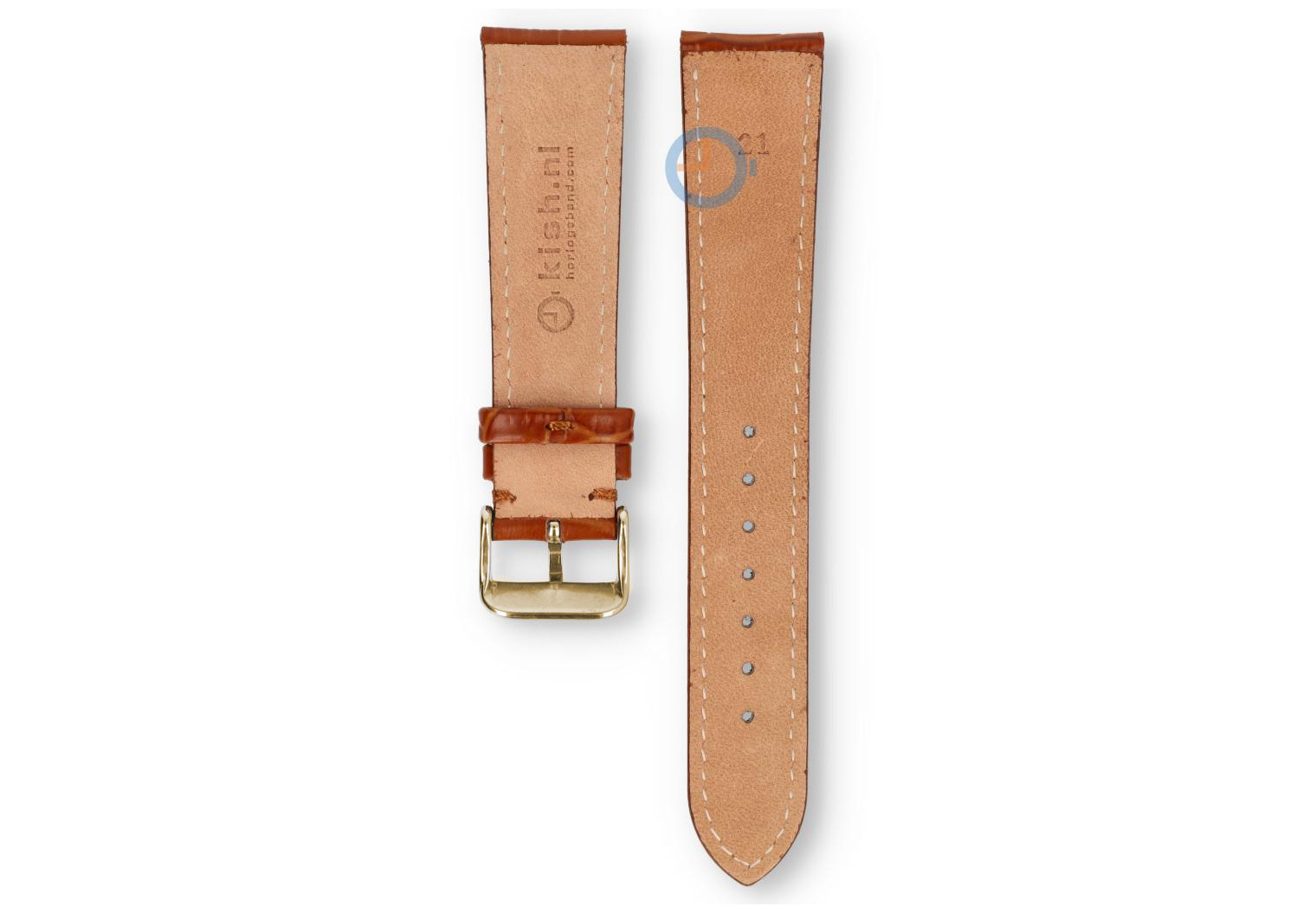 21mm uneven leather strap - cognacbrown. This watch strap has an odd size: 21mm. You can find an odd size watch strap at Watchstraponline.com in different sizes and colours. This high quality leather has tone-in-tone stitches and a classic croco-print. The buckle is gold in high-gloss steel and comes fitted.