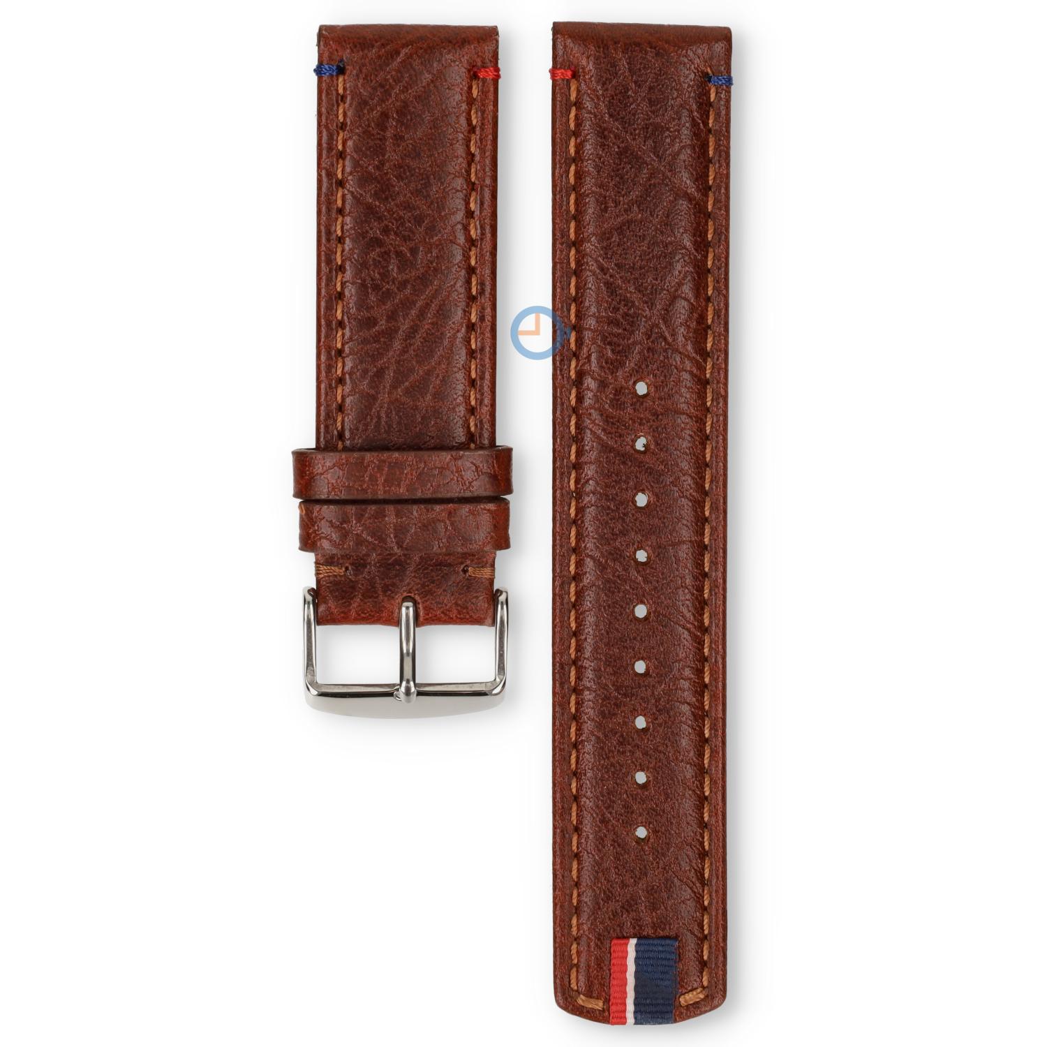 Leather watch strap with striking stitching.