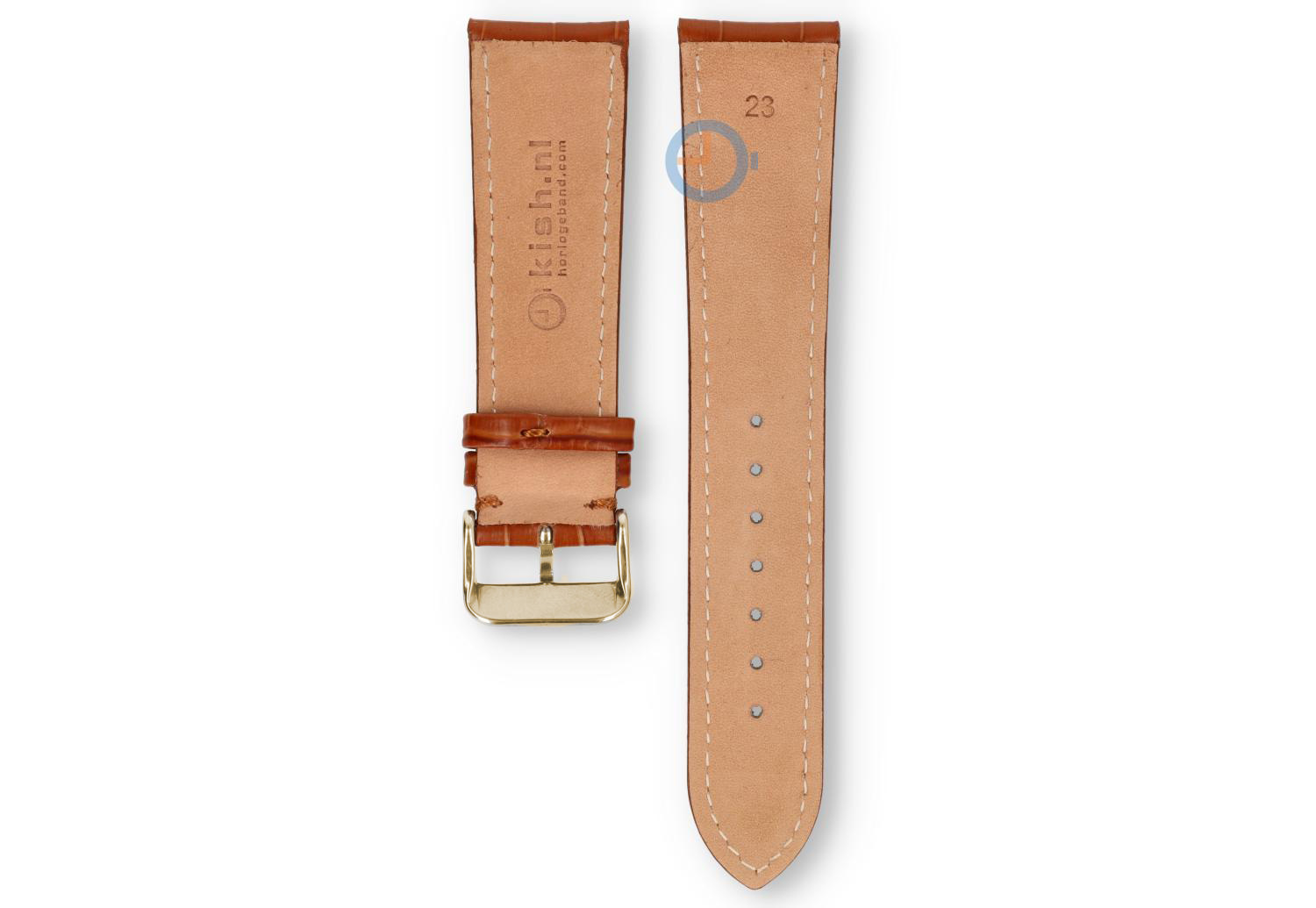23mm uneven leather strap - cognacbrown. This watch strap has an odd size: 23mm. You can find an odd size watch strap at Watchstraponline.com in different sizes and colours. This high quality leather has tone-in-tone stitches and a classic croco-print. The buckle is gold in high-gloss steel and comes fitted.