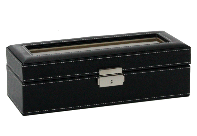 Luxury leather watchbox to storage 5 watches. This box has a plastic window so you can see all your watches. The watchcase is made of highquality wood and has a leather layer. This black watchbox has 5 cushions with a width of ca. 45mm. Every watch has his own section, so the watches wont damage eachother. The inside and cushions has a layer of ivory velvet. We will delivery two keys, so you can lock your watches safe.