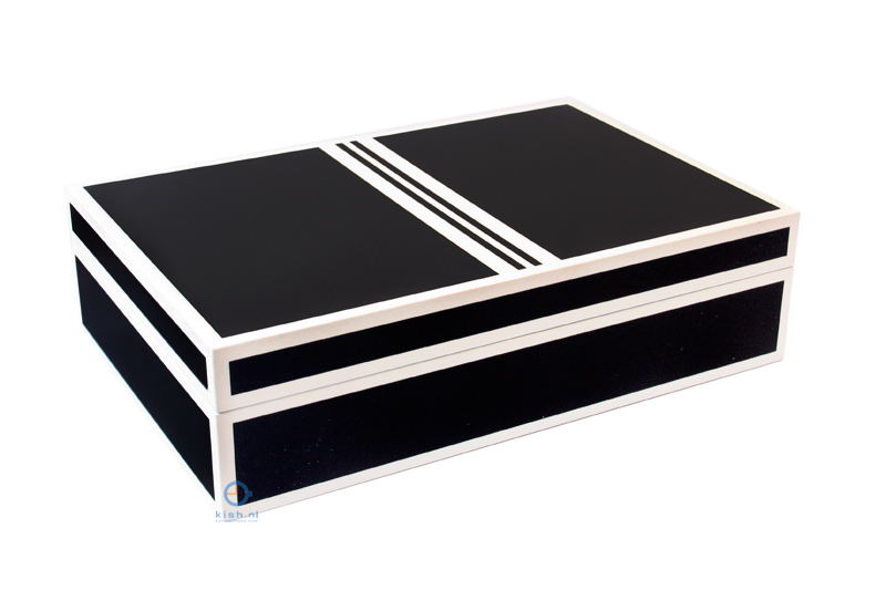 Luxury wooden watchbox to storage 10 watches. The watchcase is made of highquality wood and has a matt finish. This black watchbox has 10 cushions with a width of 50mm. Every watch has his own section, so the watches wont damage eachother. The inside and cushions has a layer of ivory velvet. We will delivery two keys, so you can lock your watches safe.