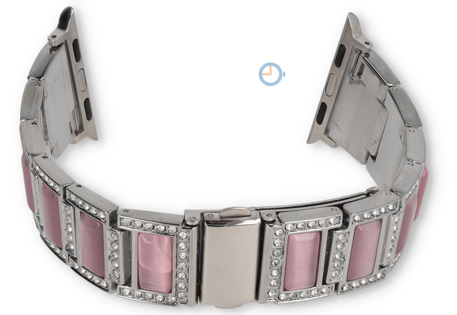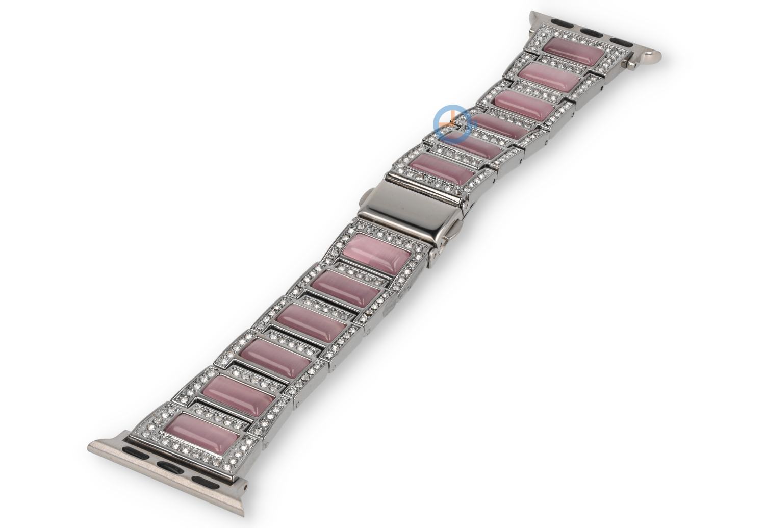 This Apple Watch strap is compatible with models: 38mm, 40mm, 41mm, and 42mm. The steel strap is made up of several links, some of which are set with decorative stones. The matching folding clasp includes side push buttons for added safety and prevents accidental opening.