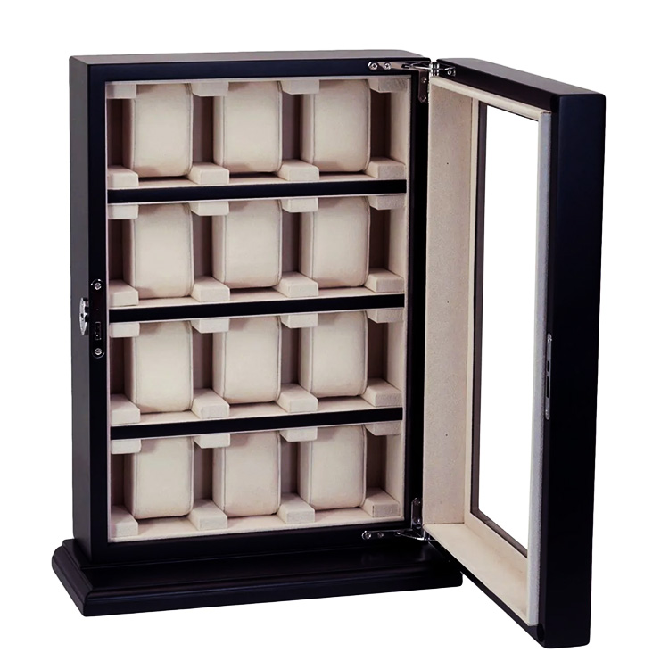 This exclusive watch display case made of wood accommodates 12 watches. Made of certified MDF wood, this display case features a soft velour lining on the inside. It features mineral glass and a sturdy lock for extra durability. The pads are easily removable, making it easy to store your watches quickly and conveniently.