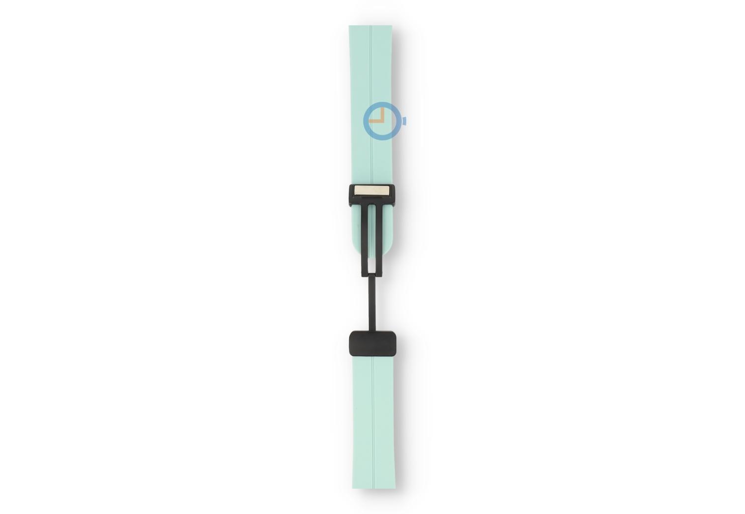 Bandje met snelwisselsysteem - 20mm - minty. Find the perfect match and choose from numerous or new colours of straps. This watch strap of 20mm, made of supple and durable silicone, instantly makes your watch sportproof in a stylish way. Perfect for sporting activities and everyday use, the band wears at different sizes - perfect for the smallest wrist. Because the watch strap has a secure, magnetic clasp, you no longer need tools to determine the size. Not only easy, but also quick.