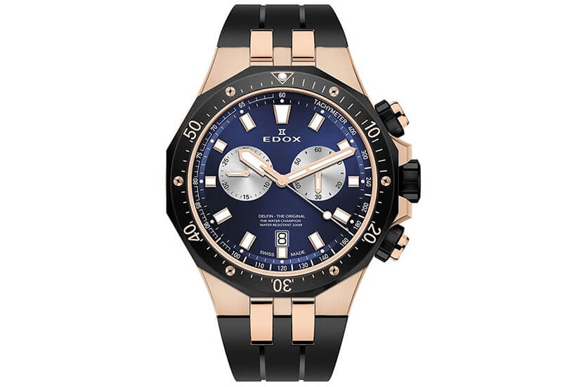Original Edox Delfin 10109 watch strap. This watch strap has a special starter on the watch case, making it suitable only for the Delfin models of Edox. The black rubber watch strap should be attached with screws to your watch. This bracelet comes with a rose gold buckle.