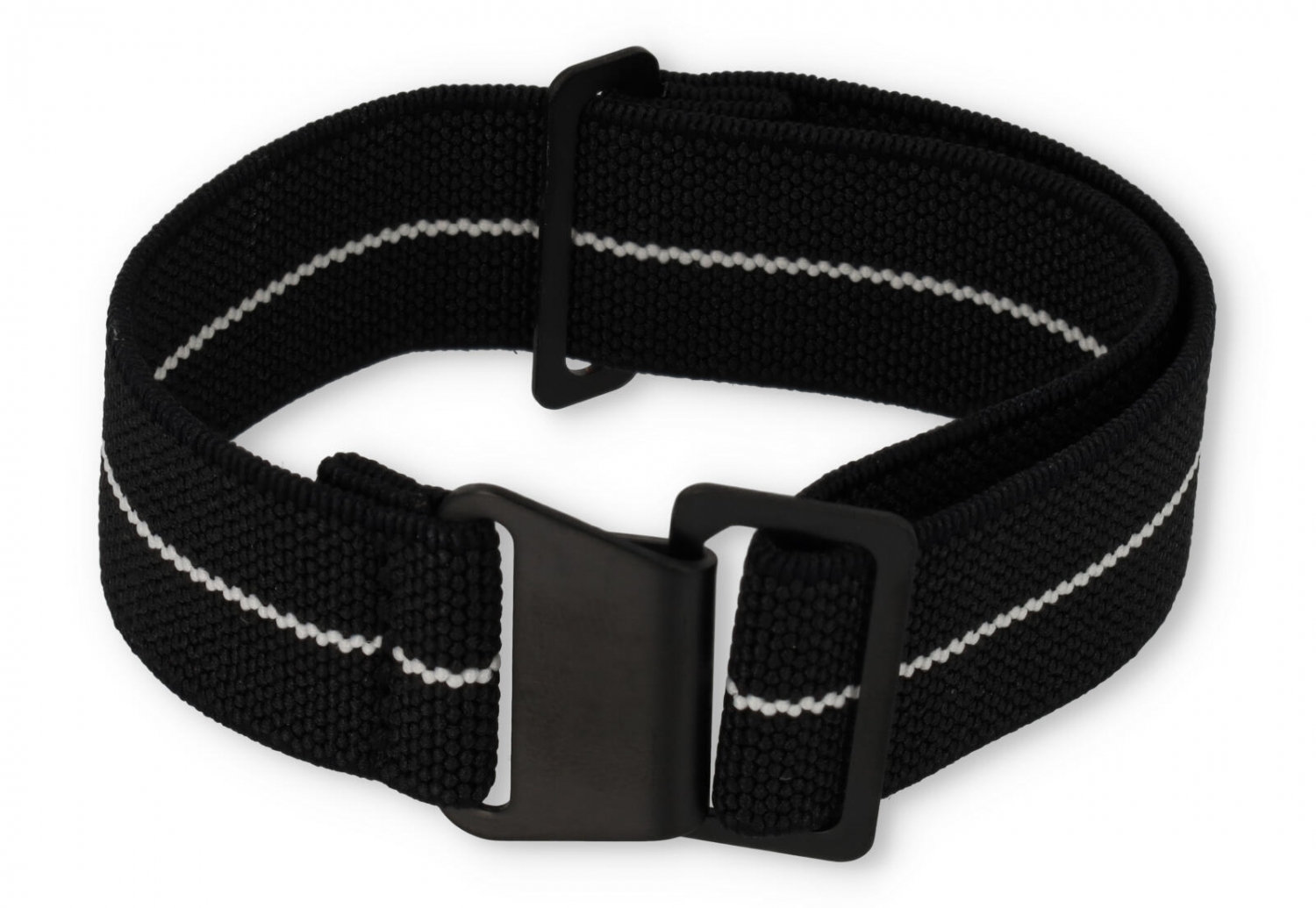 Elastic nylon woven 22mm watch strap that fits effortlessly around your wrist. This nylon watch strap is made ofparachute parts and was worn by the Navy in the 60's and 70's. Therefore this watch strap is super strong . Ideal for outdoor activities in any kind of weather. You close the watch safe and quick with the stainless steel buckle.