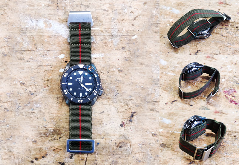 Elastic watchstrap 21mm nylon army green - red. This watchband is made of good quality nylon and closes with a handy hook closure. Because of the elastic material it fits well around the wrist and is therefore ideal for all outdoor activities. The size of the watch strap is adjustable by the iron tensioner. Super handy and you never have to add extra holes.