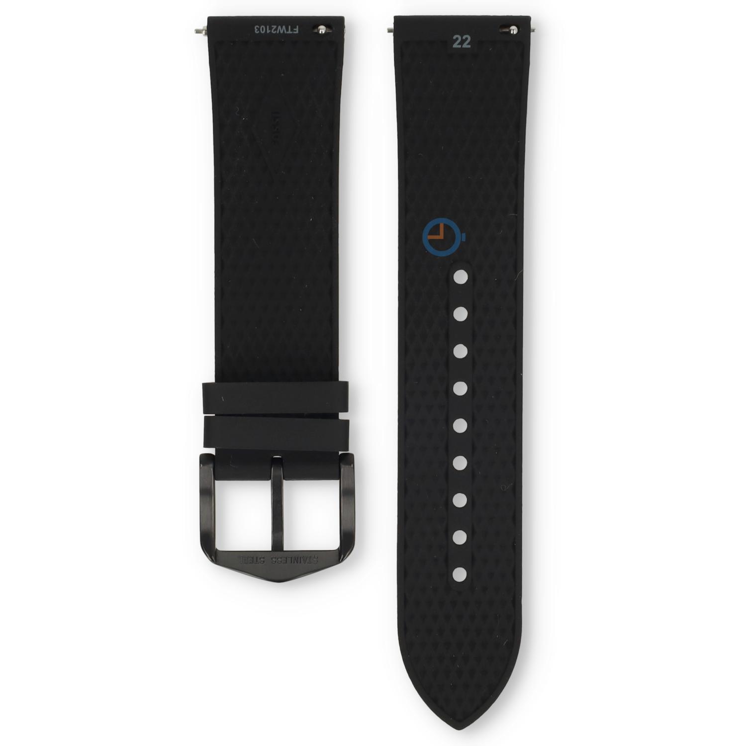 Fossil Q FTW2103 watchstrap. This strap is made of silicone and has a fine comfort. This black 22mm silicone watch strap comes with buckle and quick release system. Order the springbar removal tool along to refresh catch the strap even easier. View all Fossil watchstraps in our shop.
