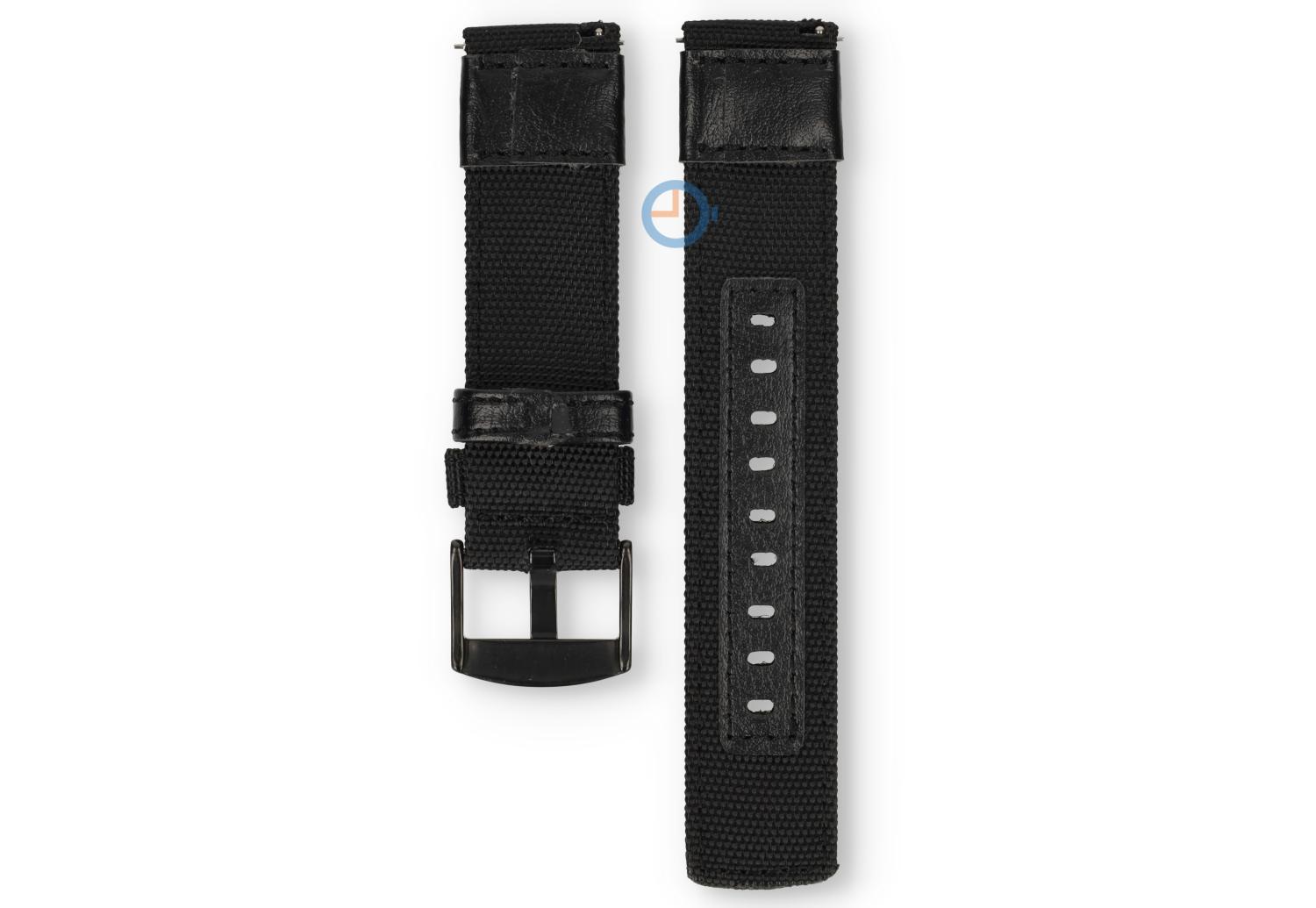 Experience the best of both worlds with thisblack hybrid watch band van nylon and leather. At 20 mm wide, this strap combines the robustness of nylon with the sophistication of leather, for a stylish and durable choice. The leather reinforcement at the onset and hole side provides extra strength in the most used areas, making your watch strap last longer.