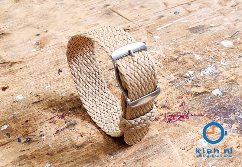 Perlon is a very strong synthetic fibre that is related to nylon. This material is used in parachutes and ropes for the Air Force and the Navy. The braided bracelet can take a beating and is water resistant. en is waterbestendig. The edges of the bracelet are sealed with a laser, so the bracelet has no frayed edges.