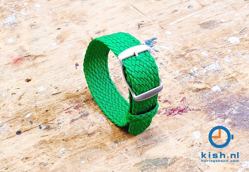 Perlon is a very strong synthetic fibre that is related to nylon. This material is used in parachutes and ropes for the Air Force and the Navy. The braided bracelet can take a beating and is water resistant. en is waterbestendig. The edges of the bracelet are sealed with a laser, so the bracelet has no frayed edges.