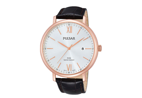 Pulsar watchstrap PS9260X1. Brown leather Pulsar strap with croco design and brown stitching. This original Pulsar strap is 20mm wide and have a rosegolden buckle fastener.