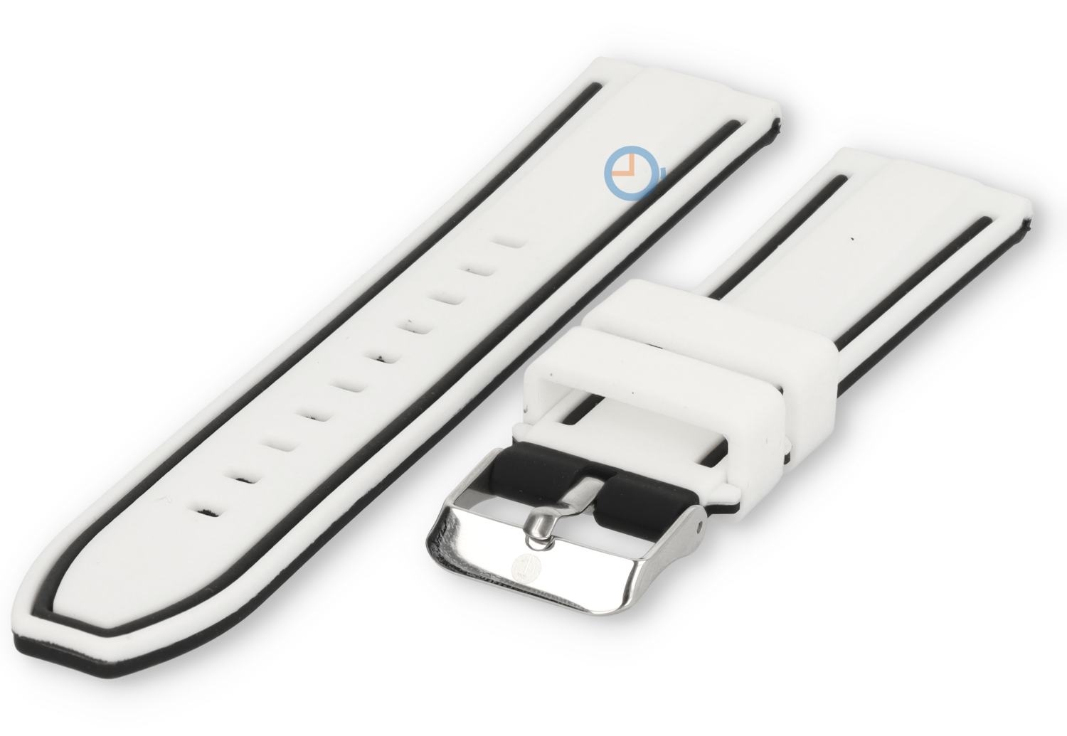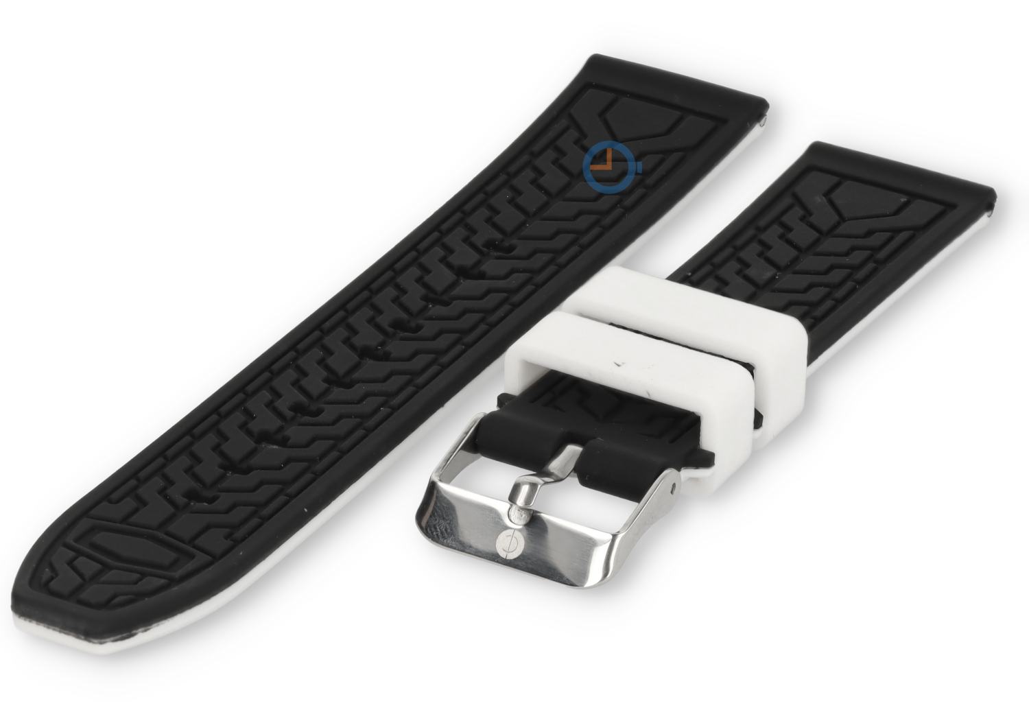 Turn your watch into an eye-catcher! This reversible watch strap has a sporty look on both sides. The white watch strap has two black lines and on the other side an blue tire pattern.