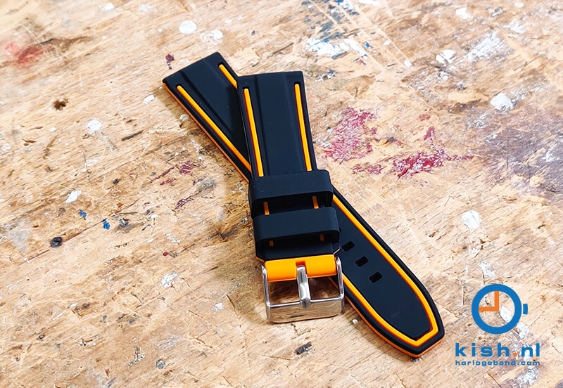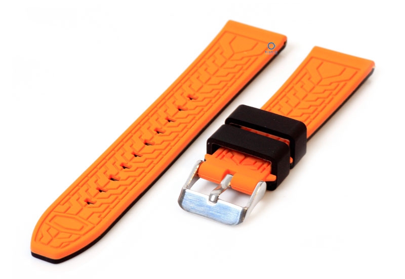 Turn your watch into an eye-catcher! This reversible watch strap has a sporty look on both sides. The black watch strap has two orange lines and on the other side an orange tire pattern.