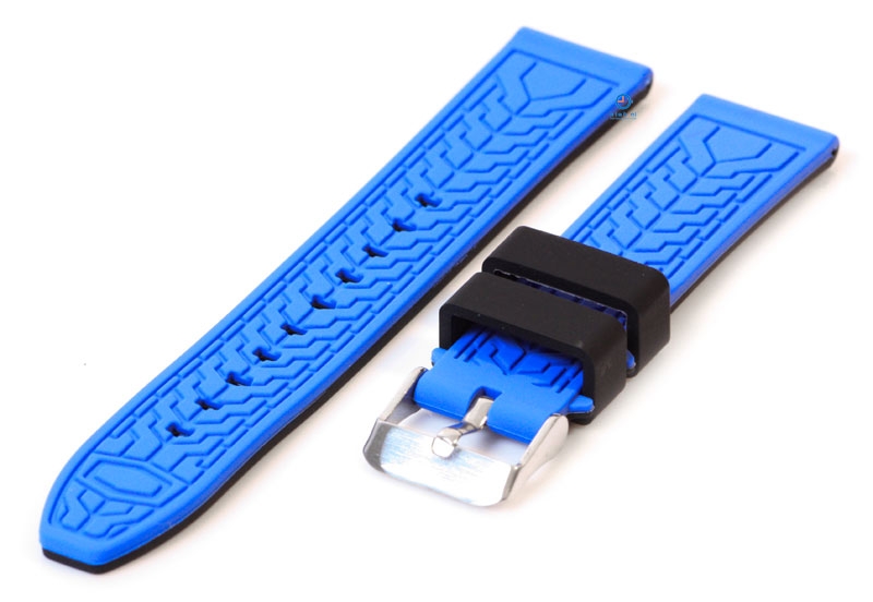 Turn your watch into an eye-catcher! This reversible watch strap has a sporty look on both sides. The black watch strap has two blue lines and on the other side an blue tire pattern.