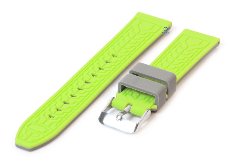 Turn your watch into an eye-catcher! This reversible watch strap has a sporty look on both sides. The grey watch strap has two green lines and on the other side an green tire pattern.