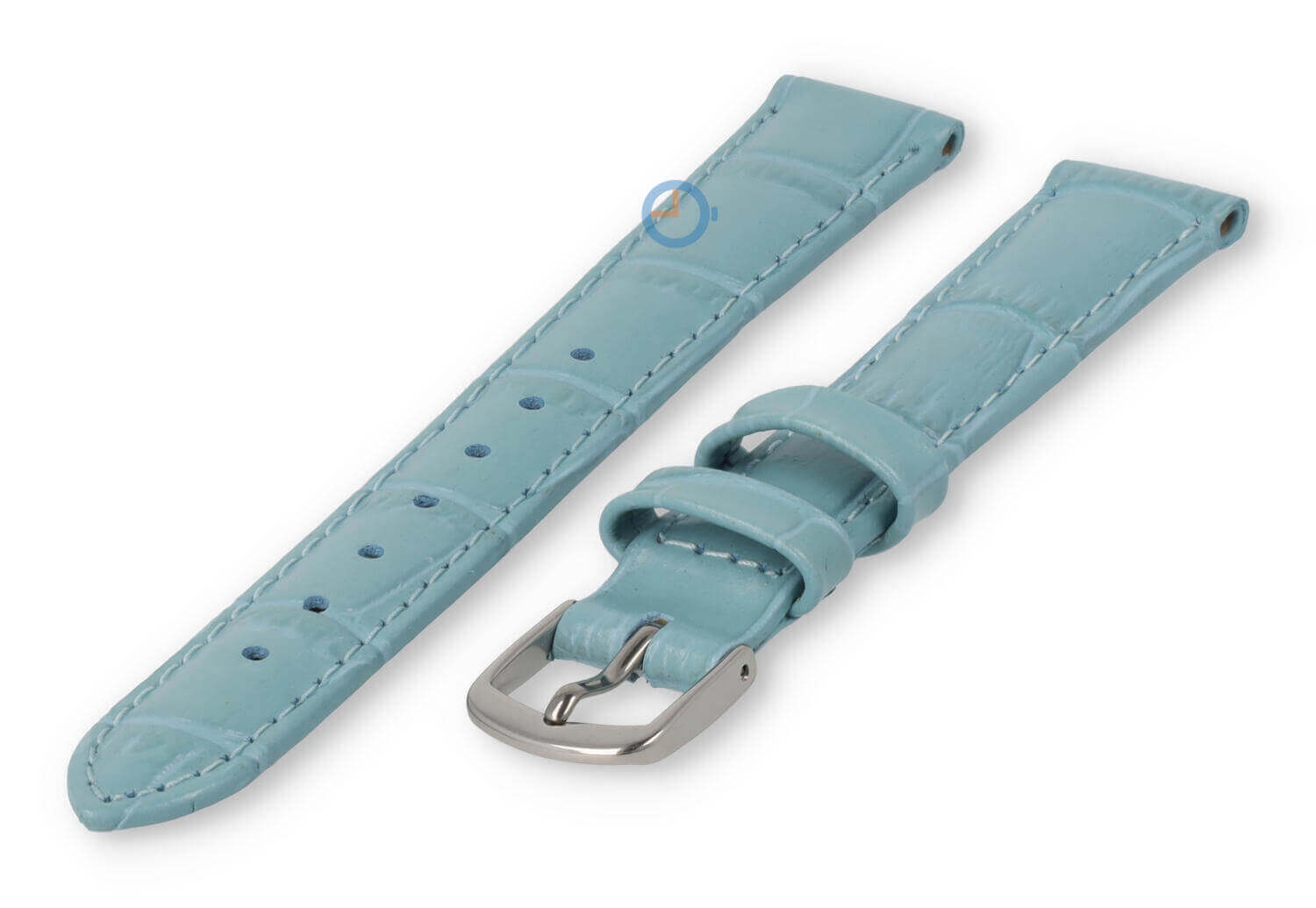 Small leather watch strap - 14mm - ice blue. A plain coloured strap with deluxe croco-print for the classic look. Make your watch complete again with this affordable watch strap. This genuine leather watch strap is 14mm wide and tapers to 12mm. You will receive this leather strap including the stainless steel buckle clasp in silver colour.