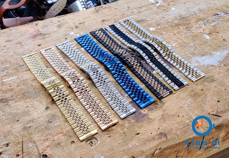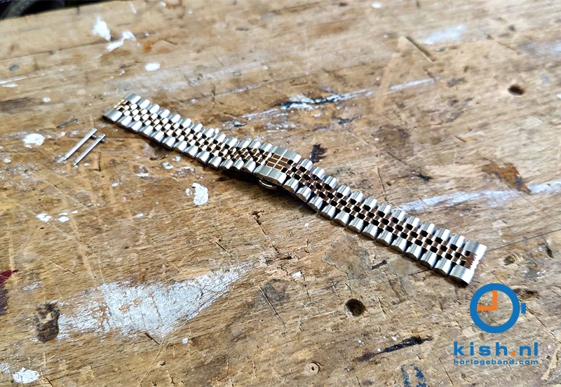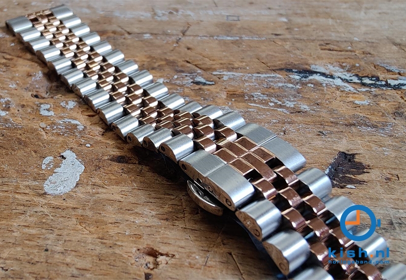 Universal watch band for watches with a 20mm start. The strap is two-coloured and made of strong steel links. The strap comes with quick switch pins and the well-known butterfly clasp with press studs. Is the strap too long for your wrist? Then easily customize this bracelet yourself and remove up to 8 links.