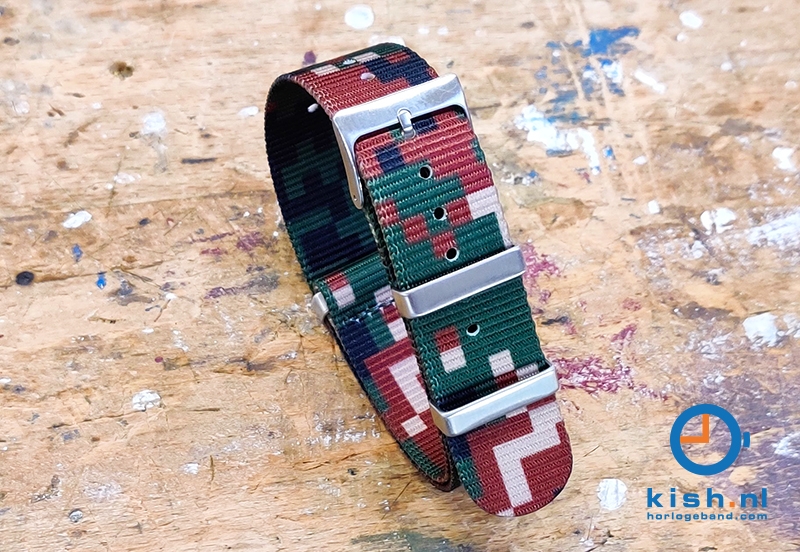 Universal watchband made out strong woven nylon – 20mm pixel camouflage green/brown. This nato-watchband is perfect resistant to water and dries fast. This watch band is made with special nato so it won’t stretch when it will be wet. Perfect for militair circumstances. This nato watch strap has strong sealed edges so it won’t fray and still be firm.