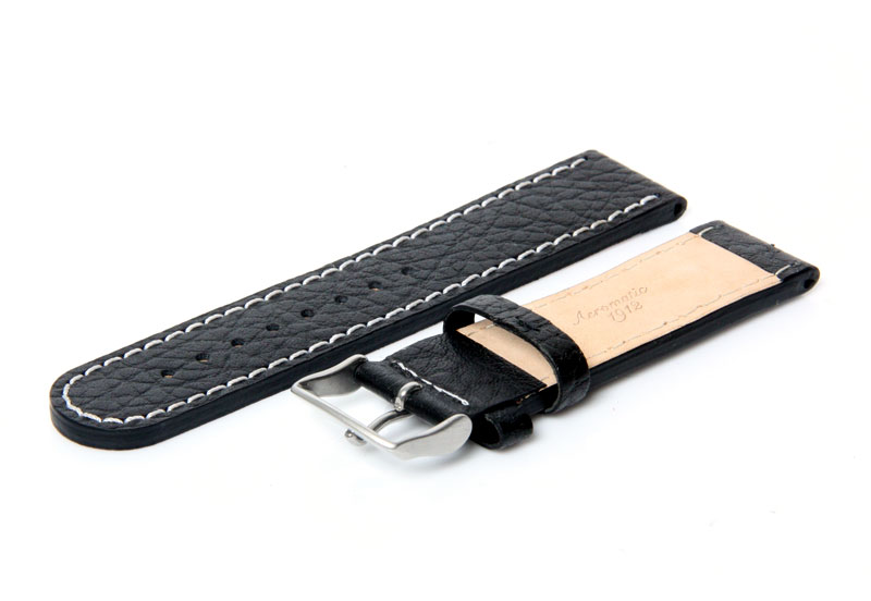 Official Aeromatic 1912 strap. The black leather strap has a white stitching and a buckle fastener.