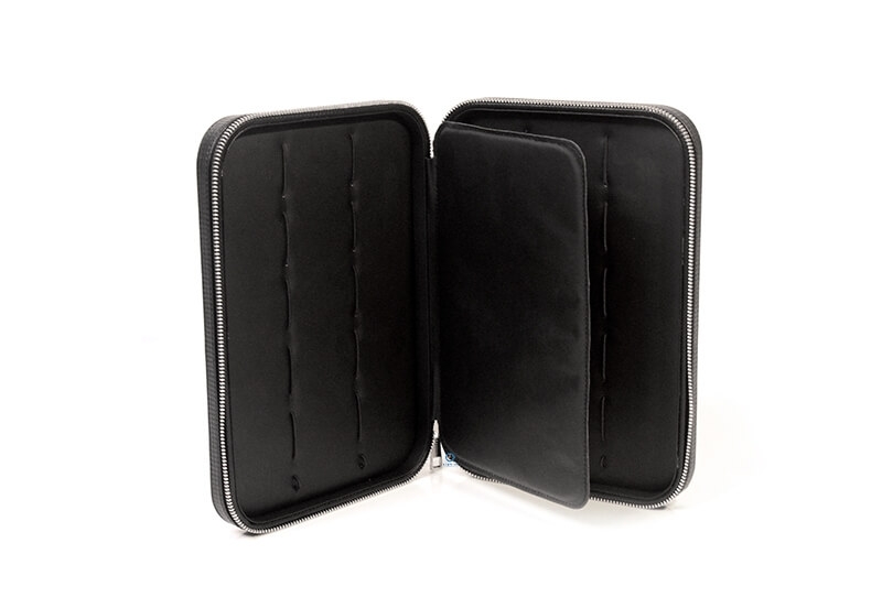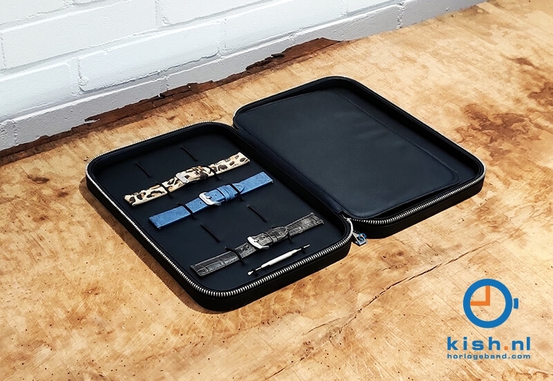 Cool, leather case for storing watchstraps. The neatly finished case is compact, but offers enough space for 10 watchstraps. You close this travel pouch with a zipper. In addition to 10 watchstraps, you can also easily store a springbar removal tool. The tool to easily change your watchstraps. You can also store other accessories such as pens or bracelets in this case.