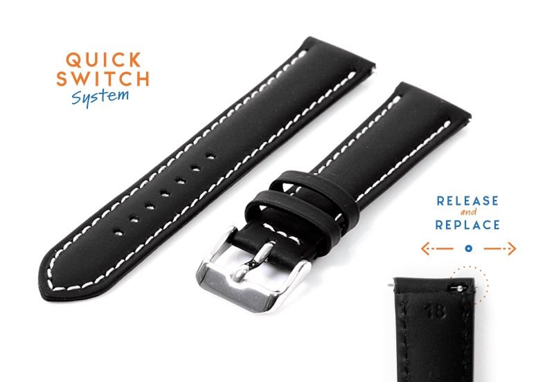 Universal watchstrap 18mm black cowhide leather. This watchstrap is made of real black leather. Eco-friendly production without chrome, without adhesive Solvents and with cotton thread. Fits on all watches with an 18m connection. Easy to replace at home with 18mm springbars and a removal tool.