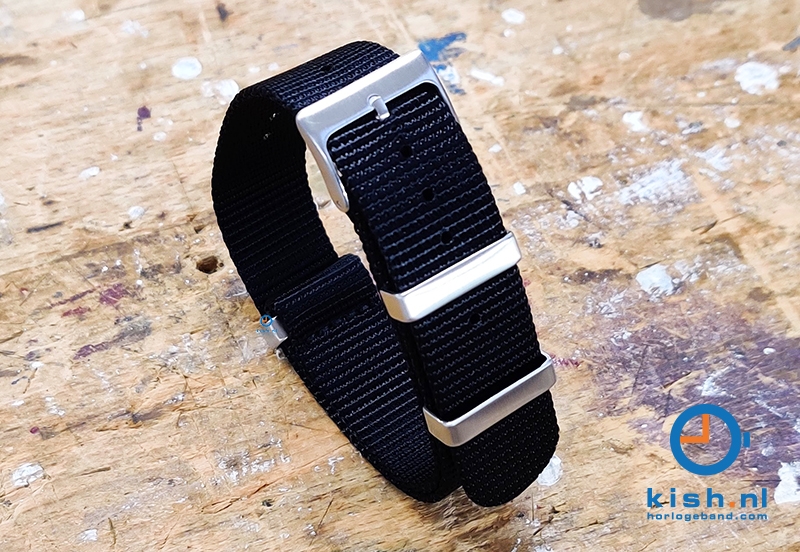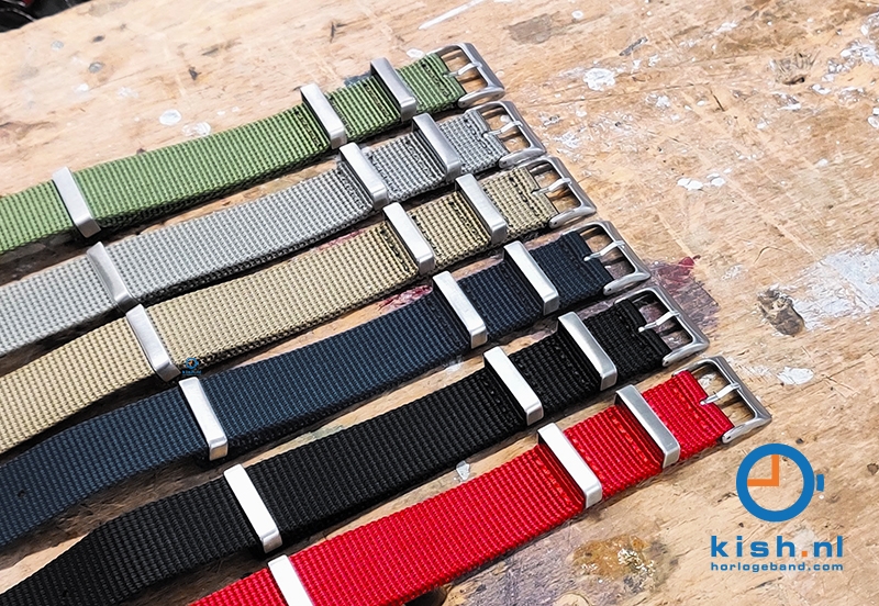 This universal nato watchstrap is made of very strong woven nylon. The nylon watchstrap prevents the watchcase from touching the skin and provides stability while wearing. This watchstrap is made in one piece and you slide through the spring bars, which are attached to the watchcase. Then pull it back through the remaining flap. This prevents the watch from sliding off the watchstrap.