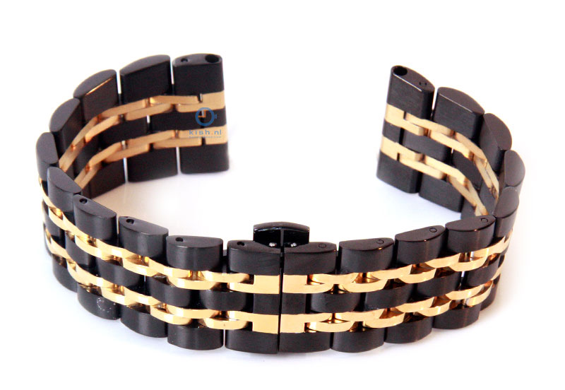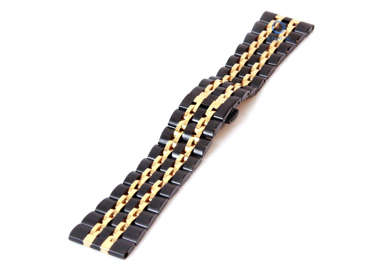 Universal watchstrap 22mm black gold. Stainless steel watchstrap with butterfly clasp is suitable for watches with a 22mm starter. This watchstrap is easy to mount on your watch, with a springbar removal tool and 22mm springbars. View all stainless steel watchstraps in our shop.