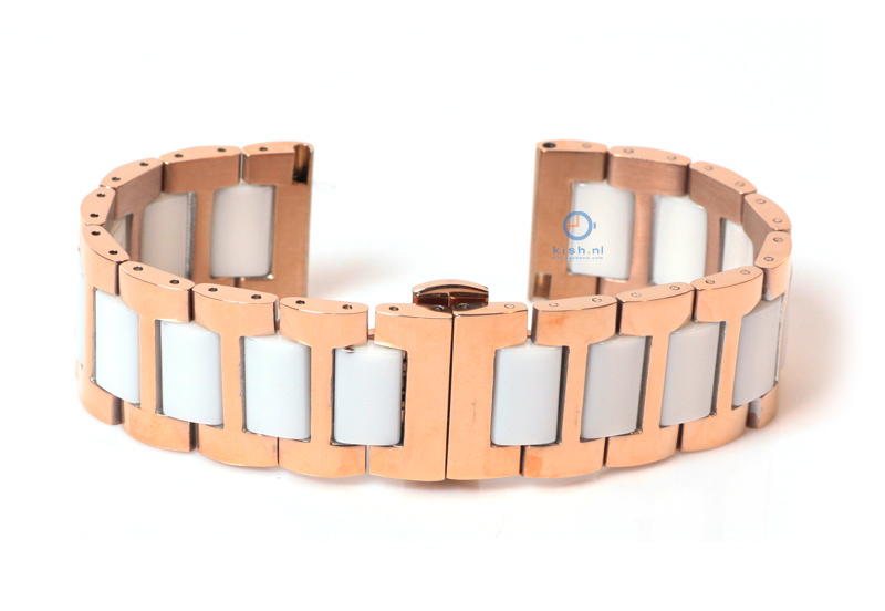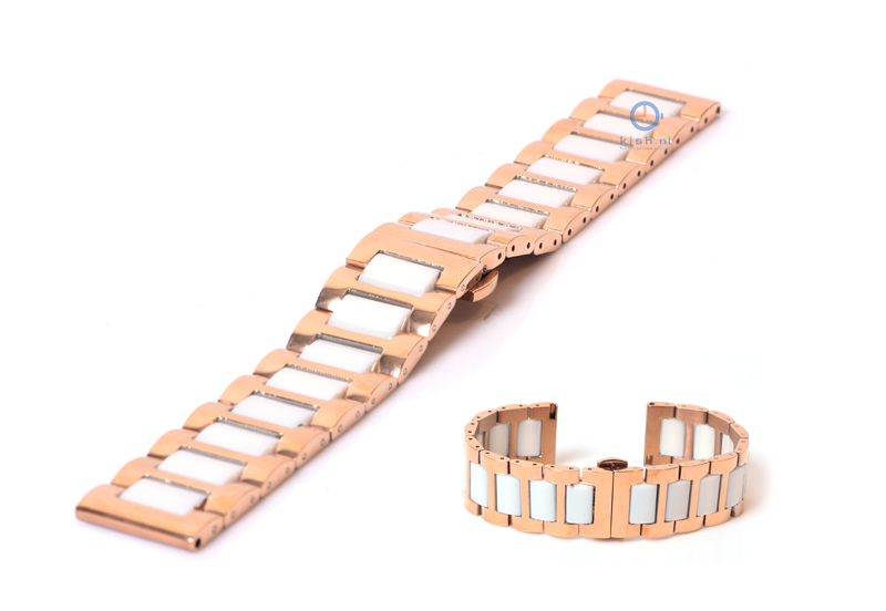Watchstrap 22 mm steel rose gold/white. This universal, stainless steel watchband features a comfortable Butterfly buckle and is suitable for watches with a 22 mm starter. The watchstrap with alternating rose gold and white links is easy to confirm with your watch 22mm spring bars and a springbar removal tool. See also the other steel watchstraps in our shop!