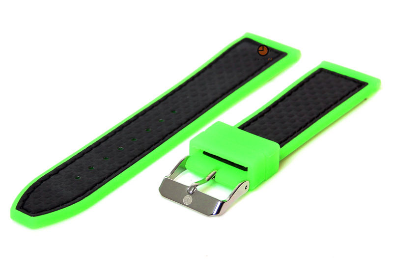 Watchstrap 24mm (neon)green with black silicone. Universal watchstrap made of real quality rubber with black stitches and stainless steel buckle. Easy to replace on your watch, with a springbar removal tool. See our instuctionvideo in the shop.