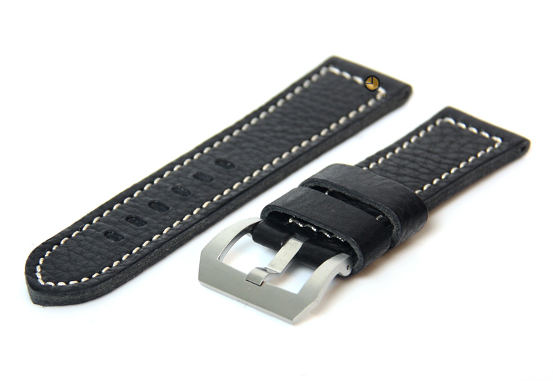 Universal watchstrap 26mm black leather. Made from high quality leather with white stitching and stainless steel panerai buckle. The band is confirmed with springbars. These are easy to mount on your watch, with a springbar removal tool. View all leather watchstraps in our shop.