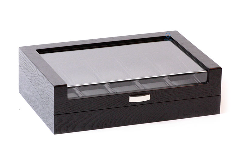 Luxury wooden watchbox to storage 10 watches. This box has no window, so your watches are storaged invisible. The watchcase is made of highquality MDF-wood and has a matt oak finish. This watchbox have 10 cushions with a width of ca. 45mm. Every watch has his own section, so the watches won't damage eachother. The inside and cushions has a layer of black PU-leather.