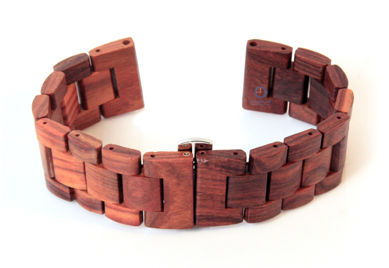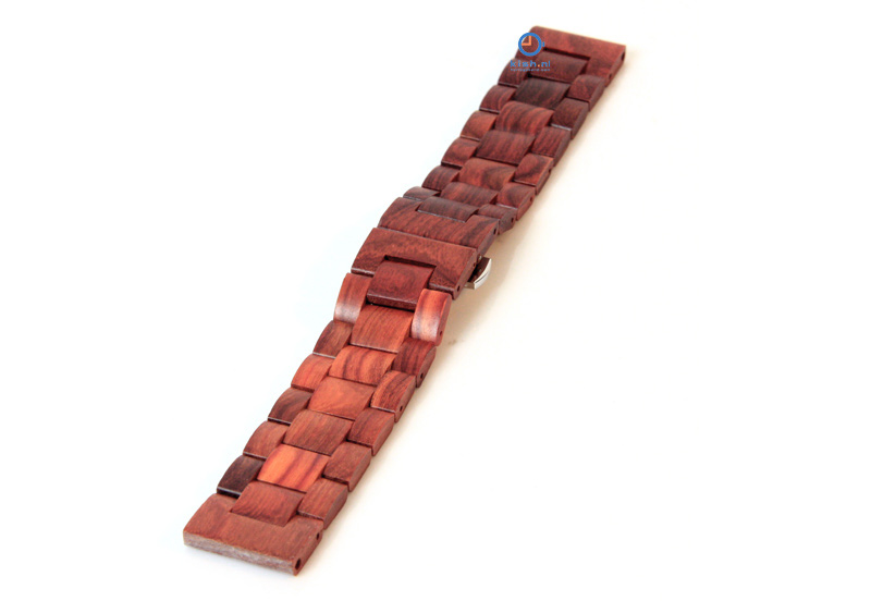 Exclusive watchstrap made of genuine wood. This 22mm watchstrap is unique, because none of the pieces are the same. The watchstrap with removable links is made of Indian Rosewood. A very strong and heavy wood. Takes an excellent polish, and is a suitable wood for the black pieces in chess sets and for billiard cues. This 22mm wooden watchstrap has a butterflyclasp made of stainless steel.